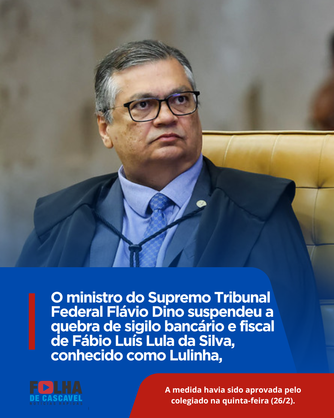 O ministro do Supremo Tribunal Federal Flávio Dino suspendeu a quebra de sigilo bancário e fiscal de Fábio Luís Lula da Silva, conhecido como Lulinha, e de outros investigados pela CPMI do INSS. A medida havia sido aprovada pelo colegiado na quinta-feira (26/2).